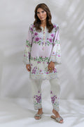 Step into a breezy and airy aesthetic with this Swiss lawn co-ord that features a fresh palette of pastel pink and blue, soft green, and ivory. This a straight cut short kurta with airy, flared sleeves and a scallpoed hemline that adds flow, while the coordinated floral trousers complete the look. Perfect for summer dinners or floral-themed get-togethers.