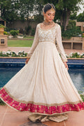 Long silhouette Kalidar in gorgeous ivory gold shade featuring old school zardozi and resham details on the bodice. The gathered flare are further adorned with sequins. The hemline is adorned with zari printed border. The outfit can be paired with gold ruffles lehenga and contrasting zari dupatta featuring a sequin border on each side.
