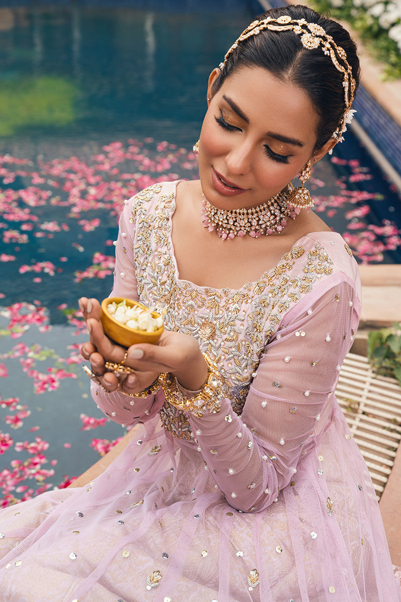 The pink net bodice kalidar is beautifully adorned with a blend of handwork, machine embroidery, and dabka detailing on the shirt. It's elegantly paired with a net dupatta featuring chan and booti patterns, along with a matching jamawar lehenga. The ensemble boasts intricate craftsmanship and a harmonious blend of elements, making it a stunning choice for any occasion.