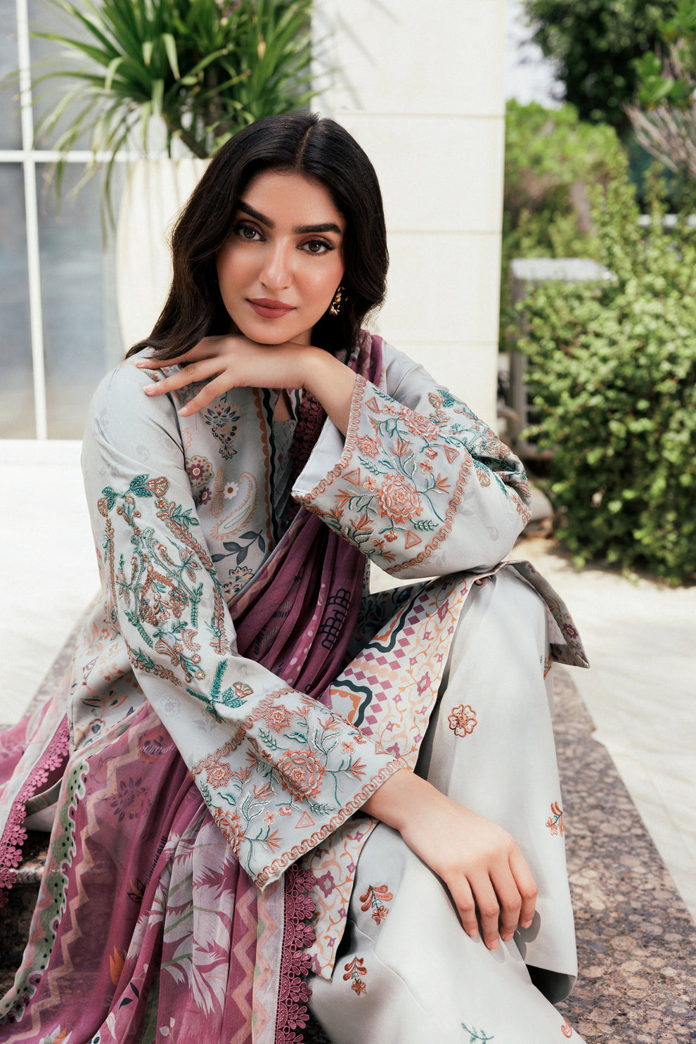 Digital Printed Viscose Front 1.25 Mtr Digital Printed Viscose Back and Sleeves 1.85 Mtr Digital Printed Chiffon Dupatta 2.5 Mtr Dyed Embroidered Viscose Trouser 2.5 Mtr Embroidered Border for Sleeves 1 Yard Embroidered Motif for Sleeves 1 Pair.