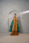 Ideal for festive occasions, mehndi events, or formal gatherings, this mustard and green outfit offers a timeless look with a modern edge.
