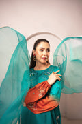 Make a refined style statement with this striking 3-piece Muse Touch Shamooz Silk ensemble, featuring a beautiful two-tone palette of sea green and burnt orange. The luxuriously soft shamooz silk fabric lends a natural sheen and graceful drape, while subtle embellishments add texture and a hint of sparkle to the richly designed shirt.