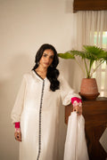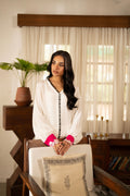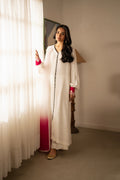 this stunning white raw silk shirt, designed to blend elegance with contemporary charm. The shirt features distinctive black loop detailing on the front, adding a bold contrast to its classic base. The embroidered sleeves bring together a beautiful mix of white, pink, and black, creating an eye-catching fusion that enhances the overall look