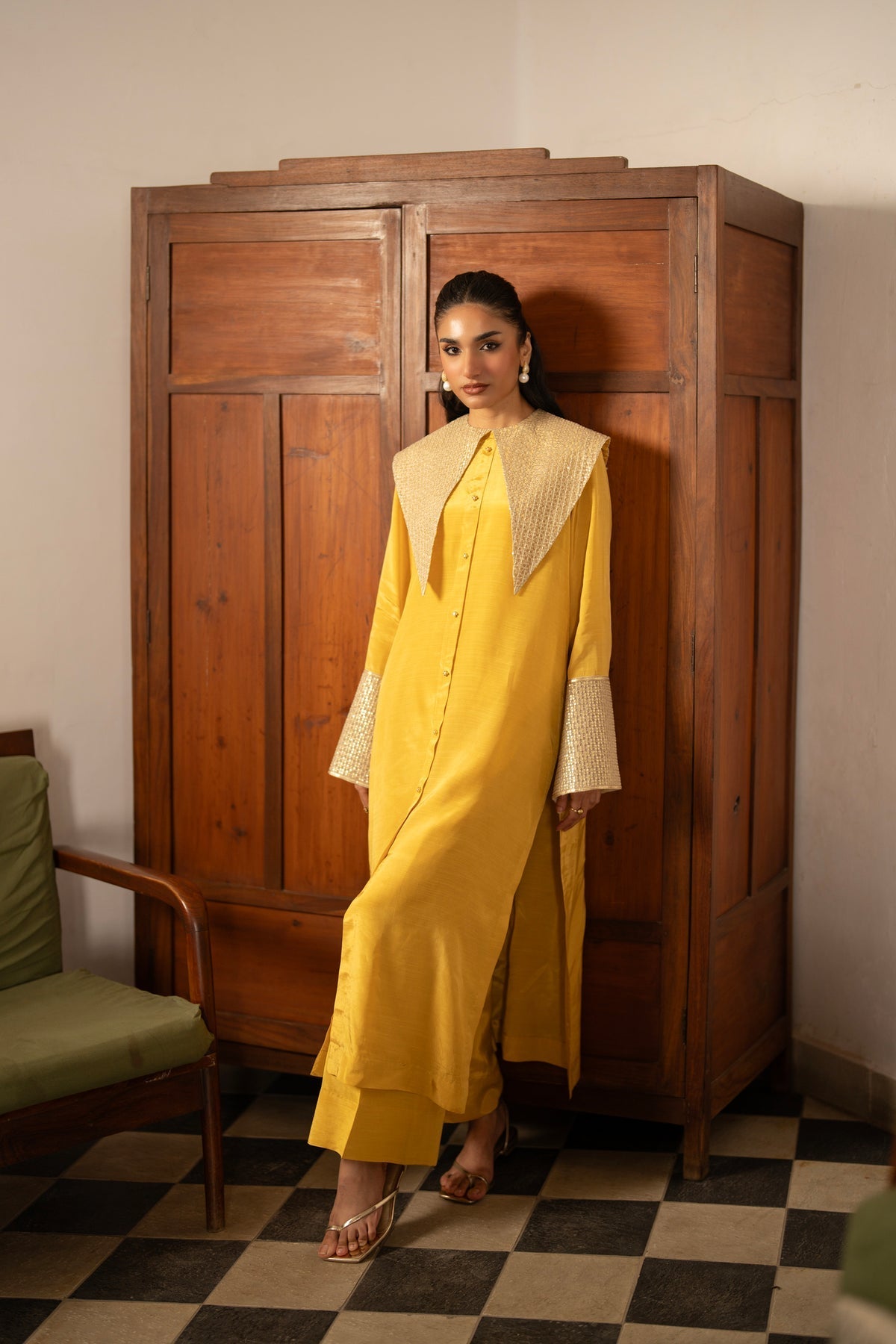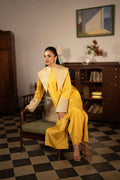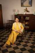 This bright yellow raw silk outfit features a long shirt with a beautifully embroidered, dramatic collar and delicate buttons on the front. The sleeves carry subtle embroidery, adding a graceful finish to the look. It is paired with loose raw silk pants, making it a comfortable and stylish choice for everyday wear or casual gatherings.