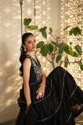 Keep your everyday style effortlessly elegant with this black 3-layered dress crafted from premium raw silk. Designed for comfort and simplicity, the dress features subtle neck embroidery enhanced with gota details, adding just the right touch of charm without overpowering the look.The outfit comes with a matching black trouser, making it an easy, ready-to-wear choice for casual outings, workdays, or basic semi-formal gatherings