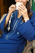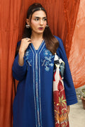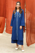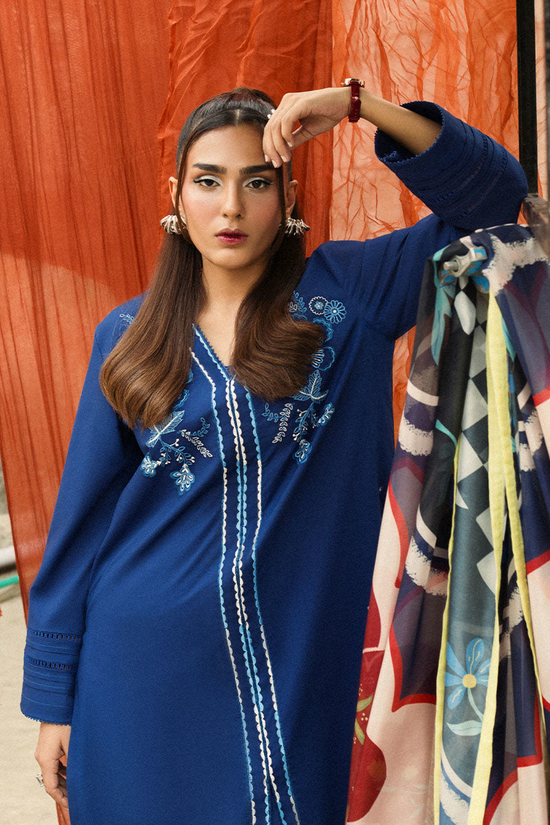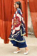 Make a statement in this 3-piece ink blue ensemble featuring a lawn cotton V-neck shirt with embroidered motifs, lace detailing, and flared sleeves. Paired with culottes and a printed silk dupatta with contrast edging, it's the perfect blend of elegance and ease.