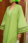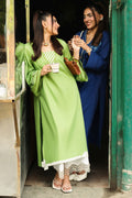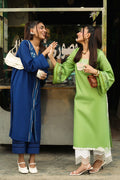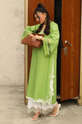 Brighten up your wardrobe with this parrot green and white lawn cotton set, featuring a mid-calf shirt with embroidered borders and criss-cross neckline detail. Flared sleeves with 3D motifs and scalloped-edge trousers add a playful yet elegant touch.