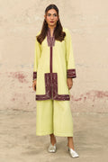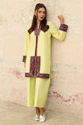 right and breezy, this lemon yellow lawn cotton set features a mid-thigh shirt with embroidered borders and a stylish front slit. Finished with pleated culottes and contrast embroidered sleeve accents, it's a fresh take on everyday elegance.