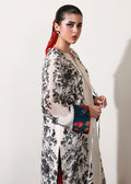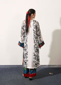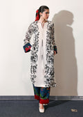 An ivory long shirt with sketchy black floral print, accented with red satin silk trims, printed tassel on the neckline and contrasting blue and red floral printed cuffs on the sleeves. Paired with matching blue and red floral printed pants, finished with a wide red satin silk border at the hem