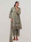 The Olive Green Cotton/Chiffon 3PC Embroidered Printed Suit from our Spring Collection features a printed shirt with cutwork embroidery, V neckline, three quarter sleeves, paired with cutwork embroidered trouser & dupatta.€‹
