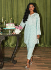 The Ice Blue Cotton Embroidered Co-ord Set from our Spring The Tea '25 Collection features a knee length shirt, round neckline with a slit, full length embroidered sleeves, paired with embroidered izaar.€‹
