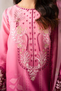 Printed cotton satin long shirt with refined embroidery concentrated on the neckline and sleeves, enhancing the blush and rose tones. Styled with a printed silk dupatta featuring lace edging for a polished look. Paired with a printed cotton satin plain trouser.