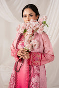Printed cotton satin long shirt with refined embroidery concentrated on the neckline and sleeves, enhancing the blush and rose tones. Styled with a printed silk dupatta featuring lace edging for a polished look. Paired with a printed cotton satin plain trouser.