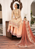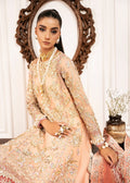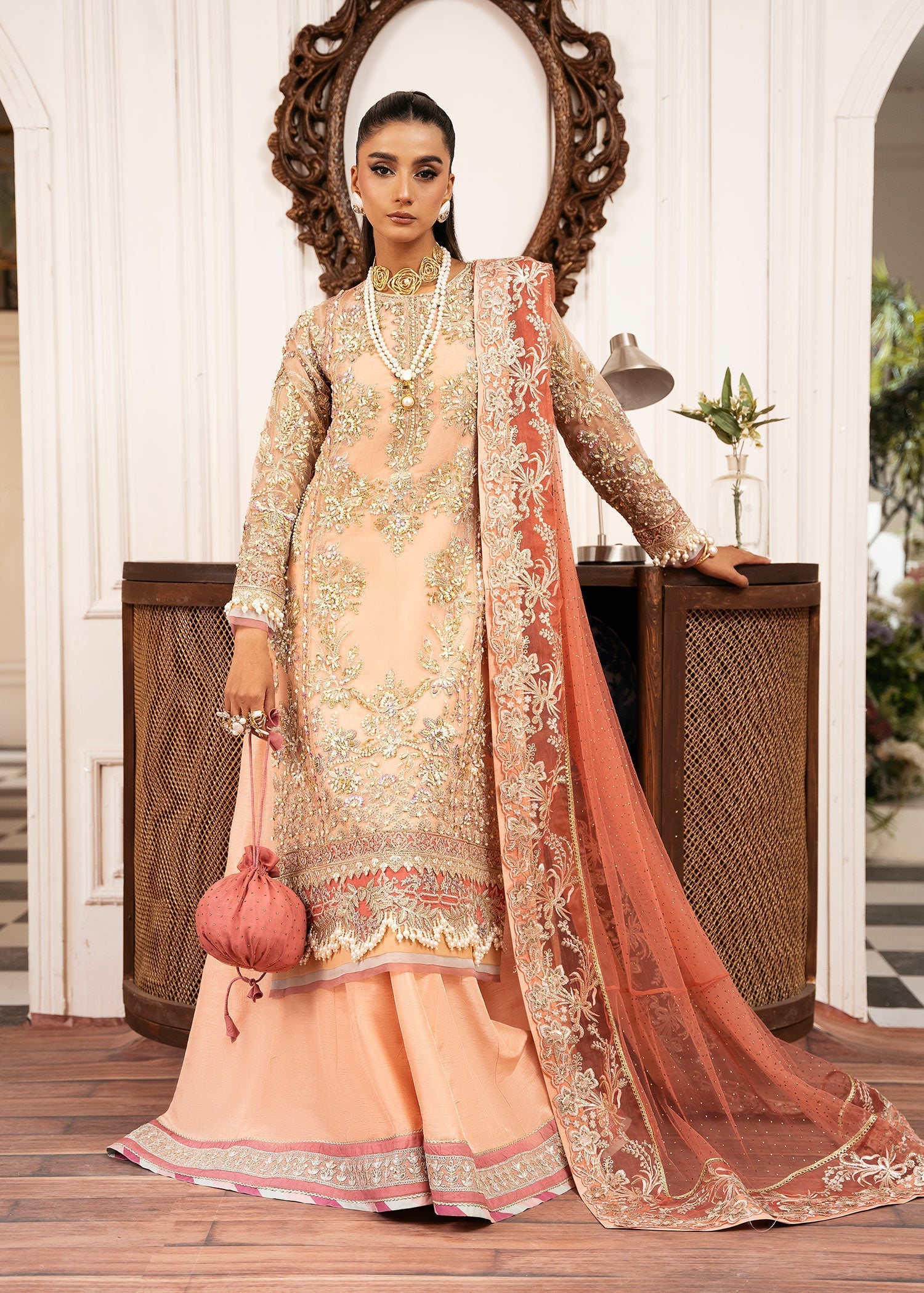 A captivating creation in a soft powder peach organza, adorned with rich dark pink borders. The mid-length silhouette is intricately embroidered with tilla, sequins, and tonal resham threads. Lavishly embellished with Swarovski crystals, pearls, and sequins, every inch of the shirt sparkles with opulence. The ensemble features our signature dupatta, embellished with over 2000 hand-applied Swarovski crystals, creating a mesmerizing shimmer. Paired with elegant dyed raw silk sharara pants, this outfit is the epitome of timeless elegance and modern luxury.