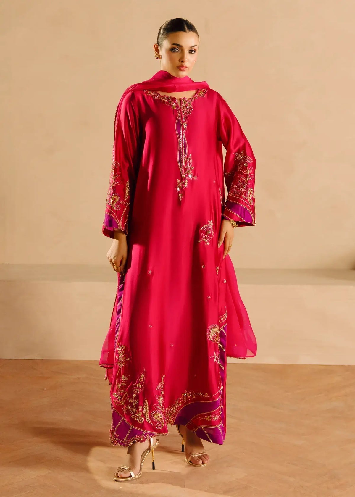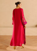 'A vibrant pink silk ensemble, Alisha Pink is adorned with rich cut dana sequin accents and threadwork. The long shirt has gold and contrasting purple detailing all over. Complemented by a pure organza dupatta and cigarette pants, this ensemble exudes elegance.