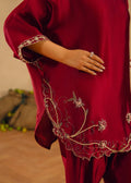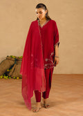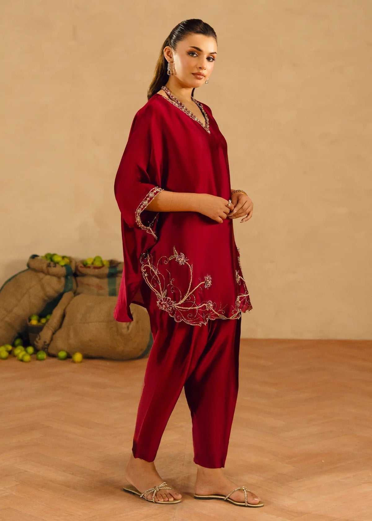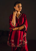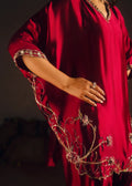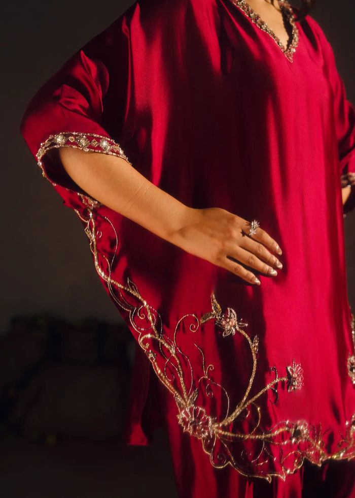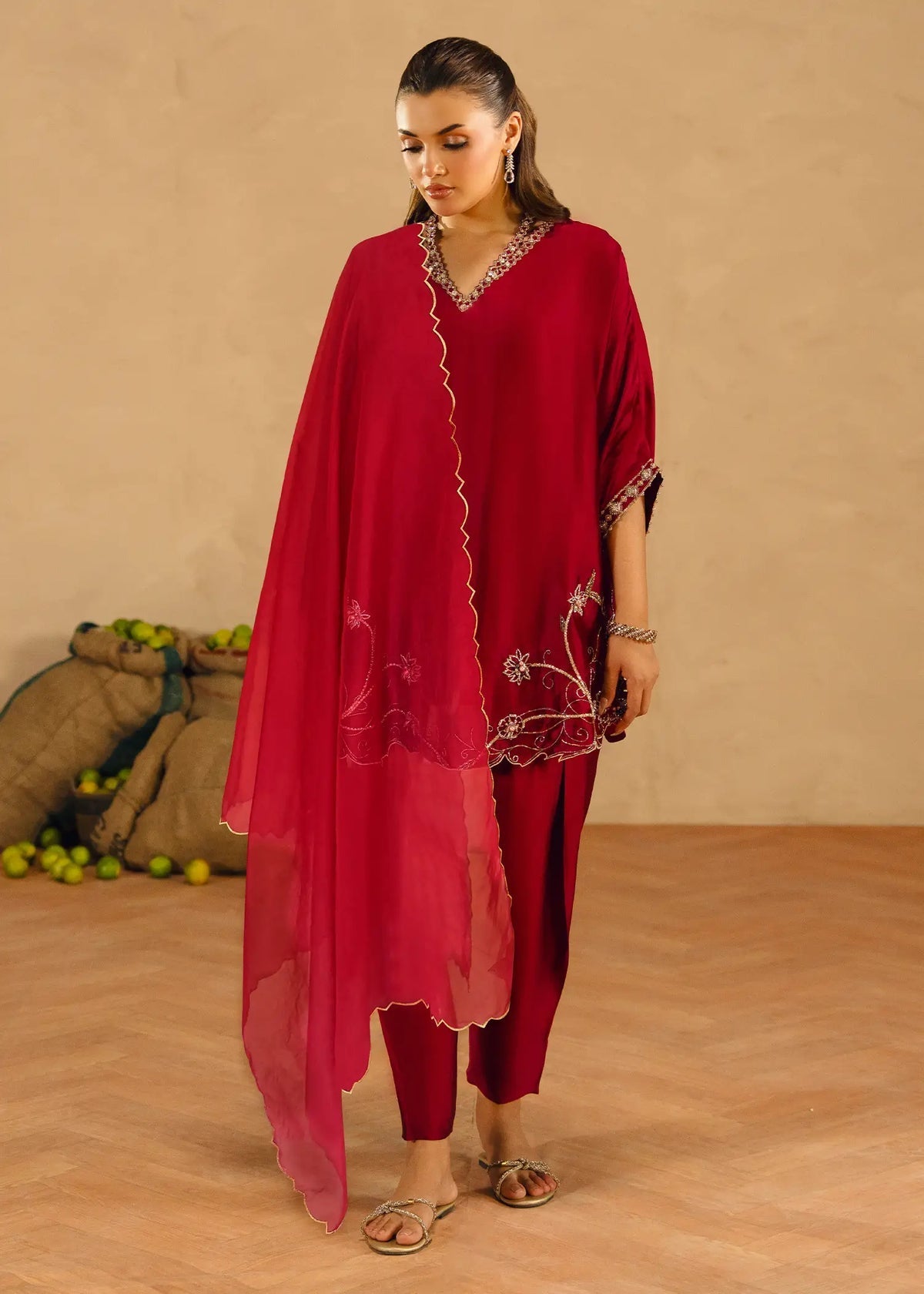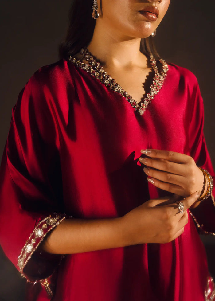 The Elara silk shirt boasts elegant bat sleeves beautifully adorned with Swarovskis and intricate dabka and cut daana embellishments, showcasing exquisite craftsmanship. The skinnyshalwar adds a modern touch, offering grace. Paired with a scalloped dupatta that adds a layer of refinement,this ensemble is perfect for making an elegant impression at any event