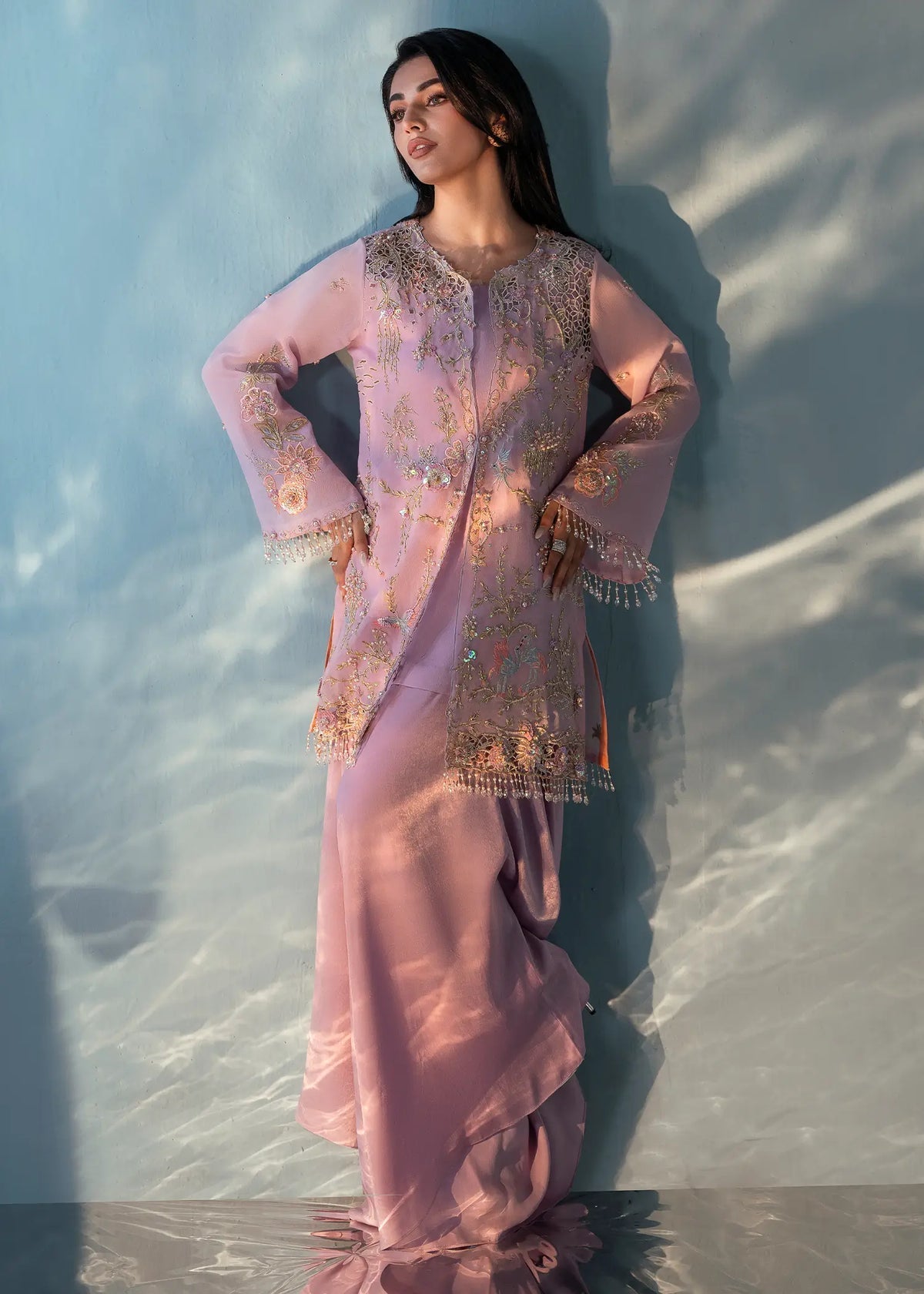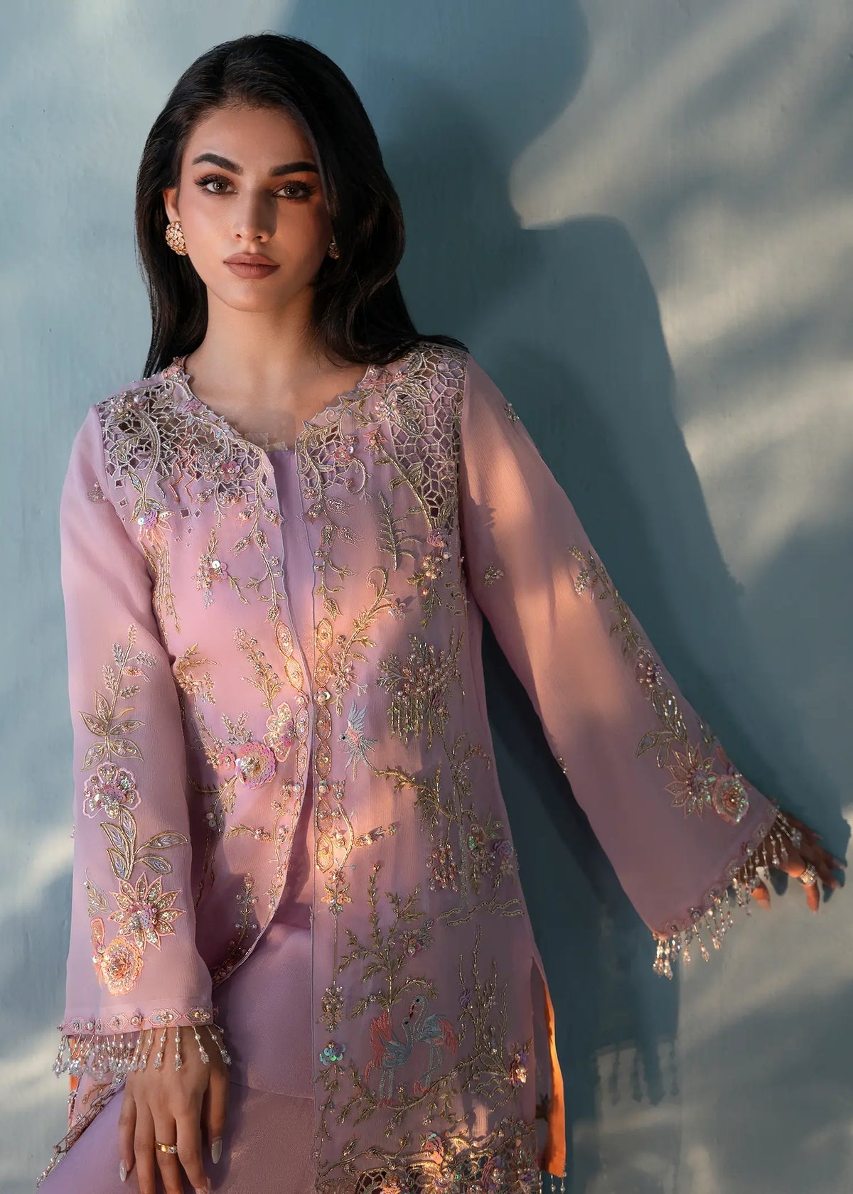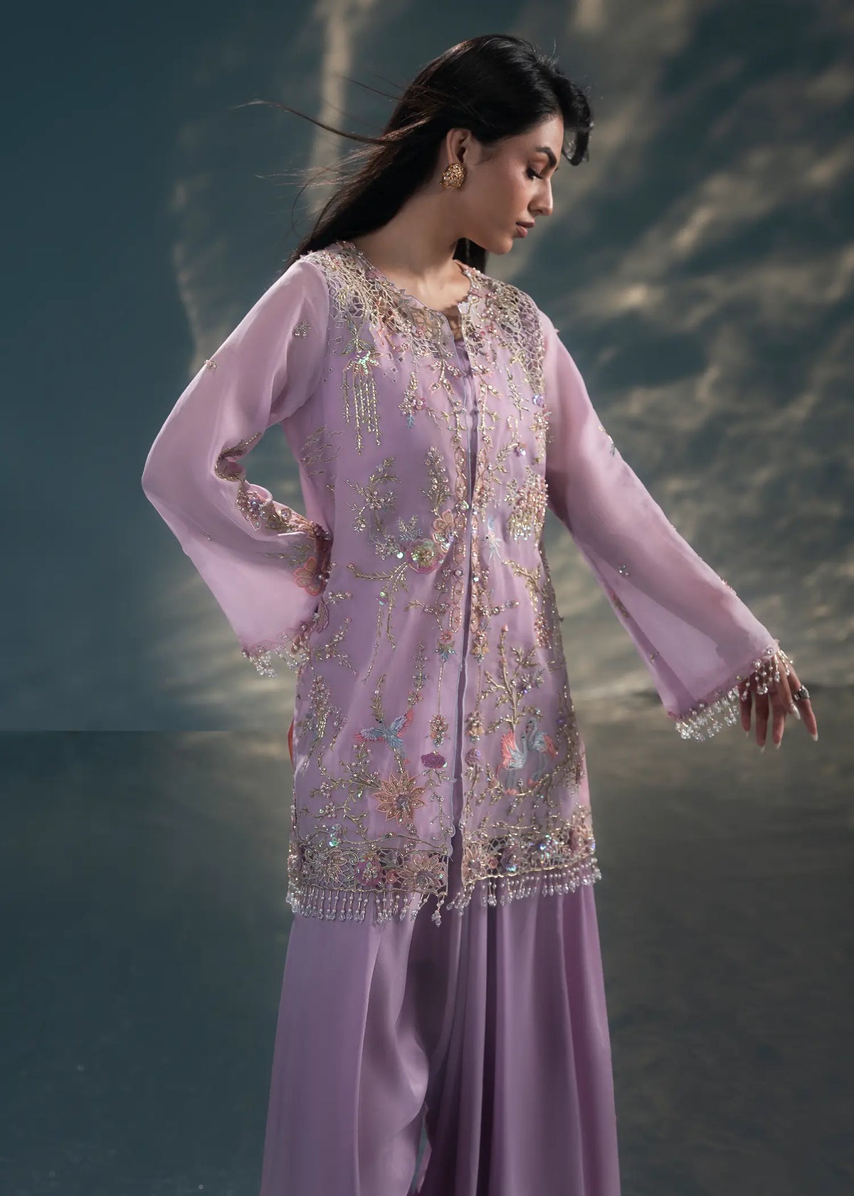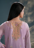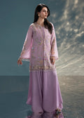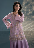 Our lavender haze jacket exudes timeless elegance and is tailored to perfection for all your soirees. It showcases fine embroidery with pearl, resham and cut daana work in floral motifs. It is paired with a matching undershirt and silk tapered loose pants for timeless elegance.