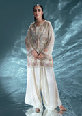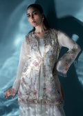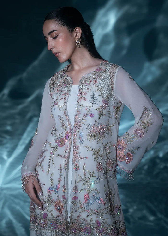 Our lavender white jacket exudes timeless elegance and is tailored to perfection for all your soirees. It showcases fine embroidery with pearl, resham and cut daana work in floral motifs. It is paired with a matching undershirt and silk tapered loose pants for timeless elegance.