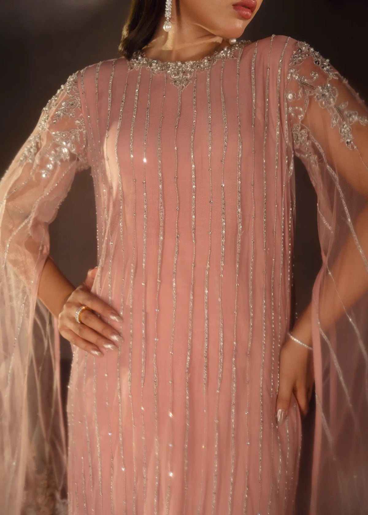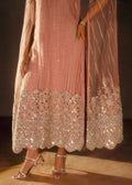 Liya Pink is a graceful net shirt with a heavily embellished front and sleeves. The dainty embellishments are in silver and pearl, sitara, cutdana, stones and Swarovski. It comes with straight raw silk trousers. This ensemble is a masterpiece that speaks if grace and elegance.