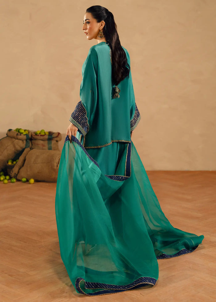 Raya Green is crafted from silk and embroidered using age-old craftsmanship, combining cut dana, and zardozi work. The shirt is patched with contrasting blue organza for extra detailing. Raya Green is paired with tapered loose pants, and a pure organza dupatta finished with a blue embellished border.