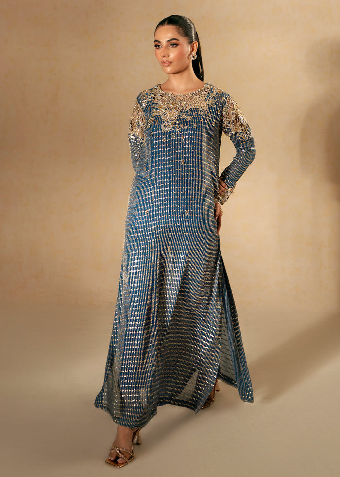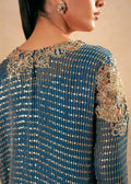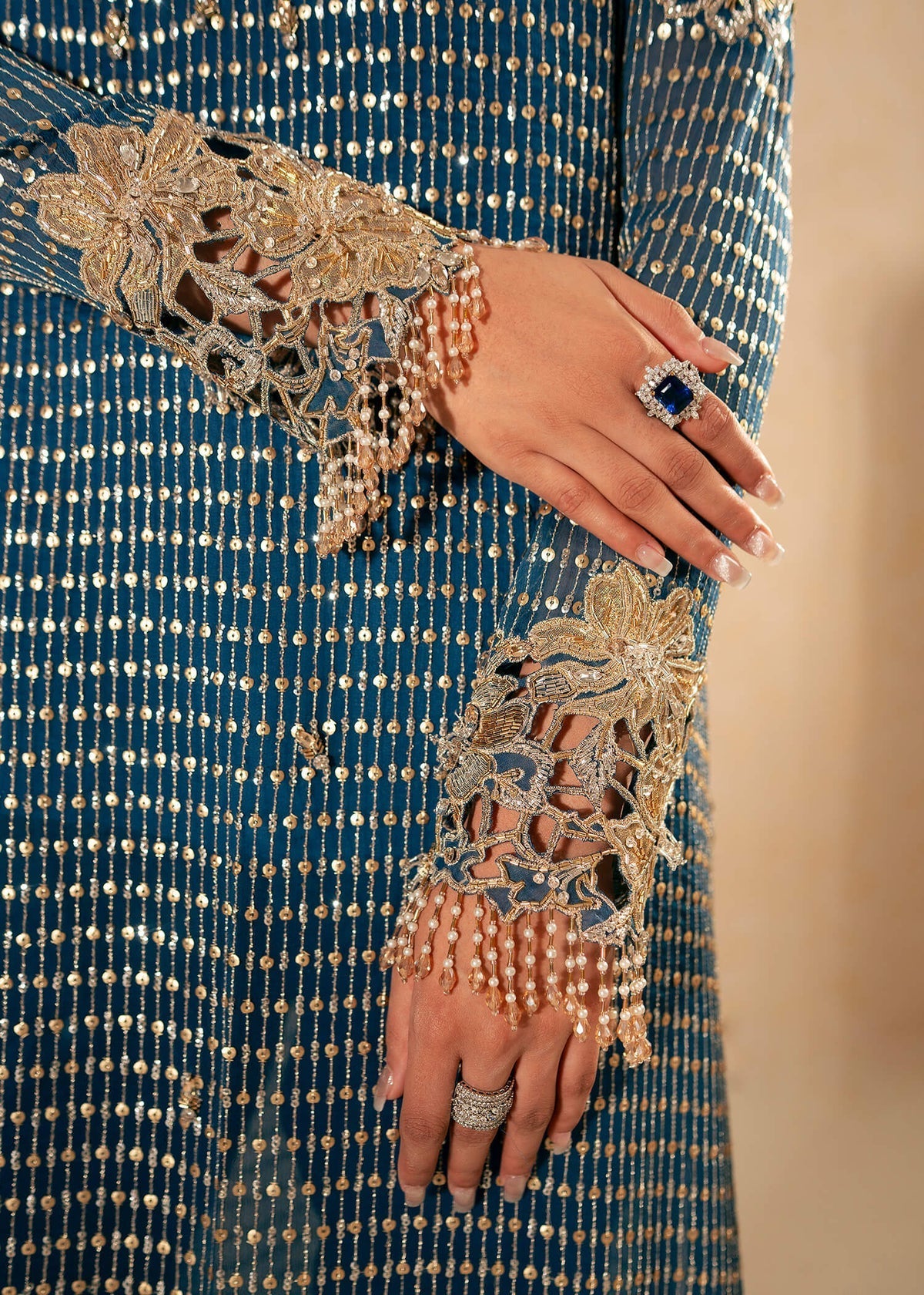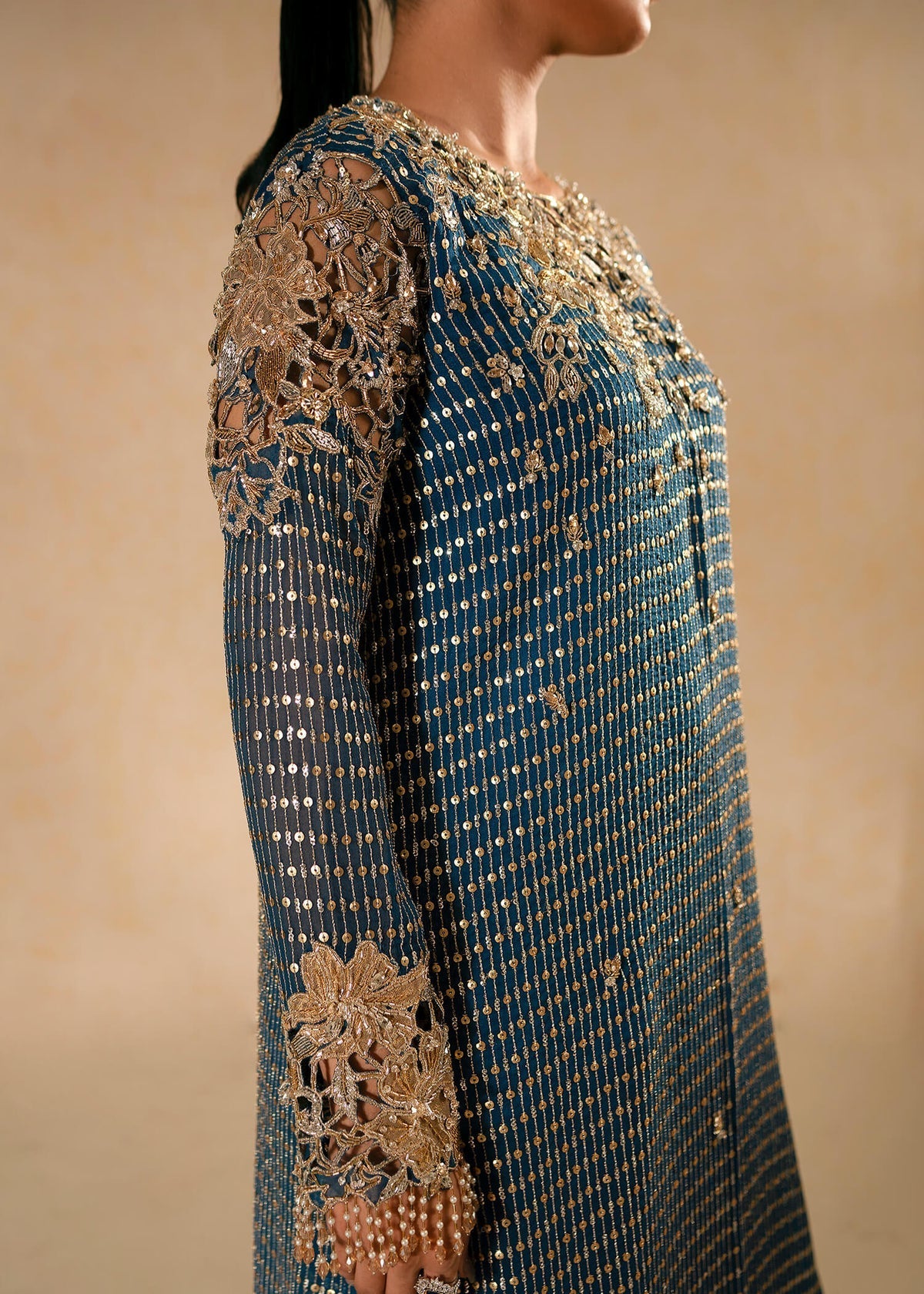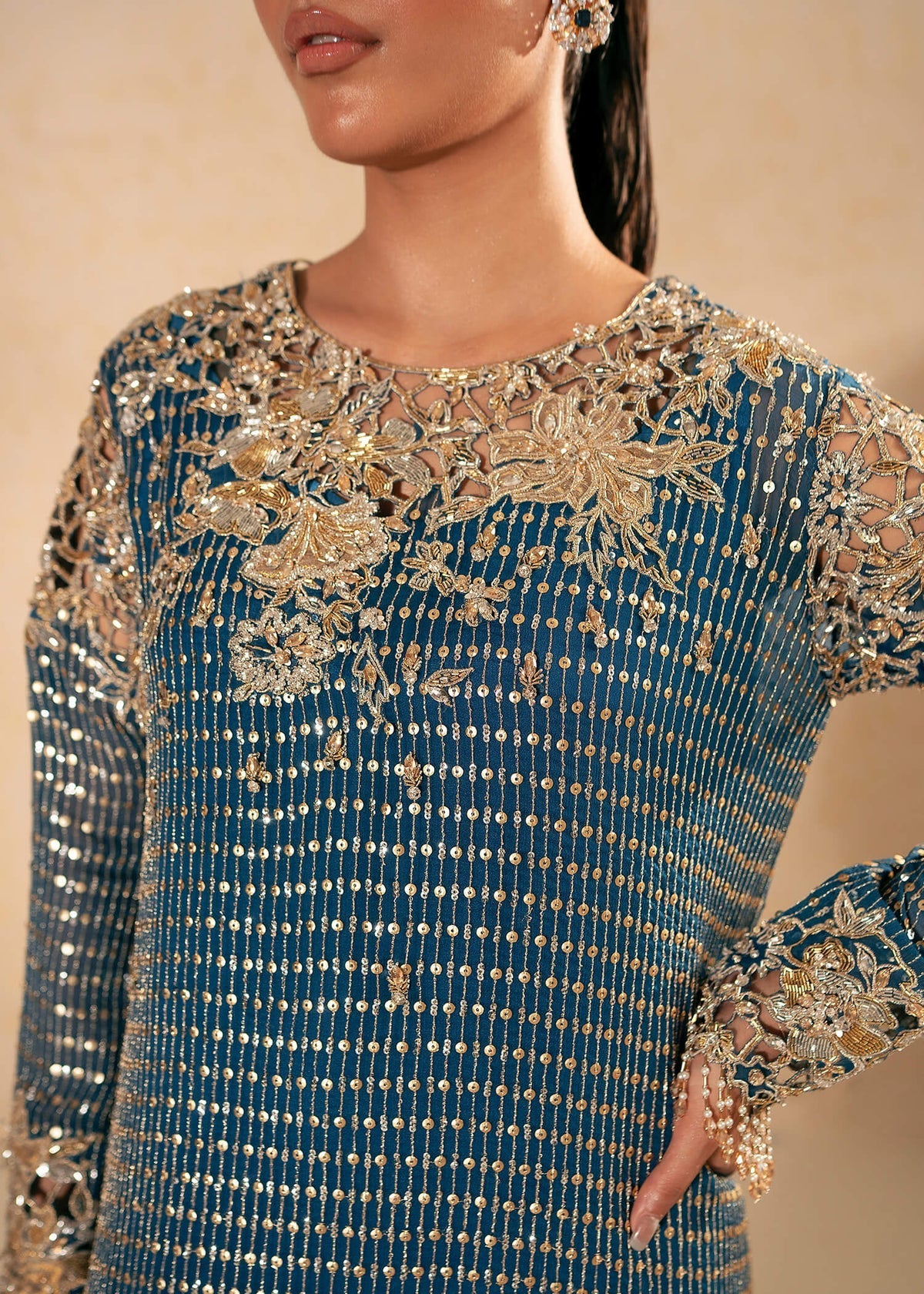 In a gorgeous dark blue, Starry Night features a straight chiffon shirt with a chic round neckline with crystal pipe and swarovski work. Crystal tassels and floral embellishments on the sleeves add elegance. Paired with straight p