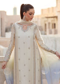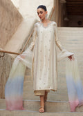 An elegant off-white ensemble crafted from luxurious pure raw silk, radiating sophistication and refinement. The long, straight shirt showcases a prominent, heavily embroidered neckline and fully detailed sleeves, with front panels enhanced by intricate lace insertions, delicate embroidery, and embroidered sprays, executed through a meticulous blend of hand and machine embroidery. The set includes tailored straight trousers accented with a complementary lace finish near the hem, while the dupatta completes the look with a subtle gradient dye effect on the pallu, adorned with delicate hand embellishments, edging, and embroidered sprays, offering an exquisitely polished ensemble for formal occasions.