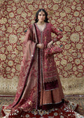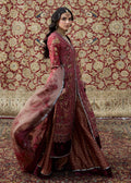 A pink-maroon karandi shirt, showcasing intricate handworked maroon embroidery with baitki and crystal-cut beads. The neckline is adorned with mirror-cut diamond motifs that extend down the length of the ensemble, accompanied by double-edged sleeves for added detail. Paired with gold-maroon jamawar pants, accented with a velvet patti for a refined touch. The look is completed with a zari net dupatta, featuring maroon embroidery, and a rich organza pallu lavishly embellished with gold sequins.