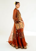A rust-toned organza full-length shirt featuring a gold shimmer shamose panel on the front, meticulously handworked with crystals and stones, and completed with elegant organza sleeves. Paired with flowy raw silk pants adorned with gold embroidery and a shimmer patti. The look is elevated by an orange organza dupatta, highlighted by an embroidered cutwork pallu and a gold shimmer patti with intricate teal detailing.