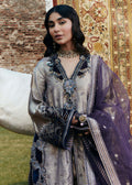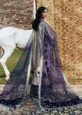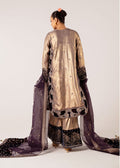 A sophisticated long shirt crafted in grey shimmer shamose, elegantly detailed with purple handworked velvet on the neckline, side borders, sleeves, and hemline. The shirt is adorned with handmade floral buttons, adding a delicate charm. Paired with straight azaar pants in grey-gold Shimmer shamose, featuring purple velvet borders embellished with sequins and embroidered motifs. Completing the ensemble is a purple organza dupatta with a velvet pallu, sequined embroidered lining, and tassels on each corner.