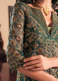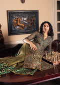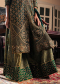 An opulent, deep green ensemble that embodies timeless sophistication and royal elegance. The long, front-slit kameez is hand-embroidered with lattice patterns, golden florals, and sequins, while sheer sleeves add a touch of lightness. Paired with jamawar Sharara pants featuring bold geometric motifs and a gilded border, and a matching dupatta with circular embroidery and sequined accents, this look balances tradition with modern majesty