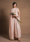 A baby pink lawn maxi shirt with tonal embroidery and side slits, offering a monochromatic aesthetic. Styled with crisp white cambric Capri pants. The medium silk dupatta adds a luxurious touch with its heavily embroidered pallu.