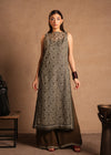 A sleeveless cotton net shirt adorned with intricate embroidery and sequin-detailed black side panels. Paired with wide-leg cotton trousers and a soft cotton silk camisolecrafted for a statement in quiet luxury.