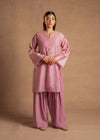 A charming blush pink kurta in embroidered lawn cotton, delicately adorned with booti and golden tila work. Paired with flowy raw silk shalwarthis ensemble is a soft celebration of femininity, elegance, and timeless grace.