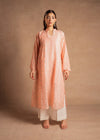 A soft peach lawn cotton kurta adorned with delicate embroidery and a gently scalloped neckline. Paired with crisp white karandi trousers, this ensemble radiates feminine charm and effortless eleganceperfect for summer soirées and quiet celebrations
