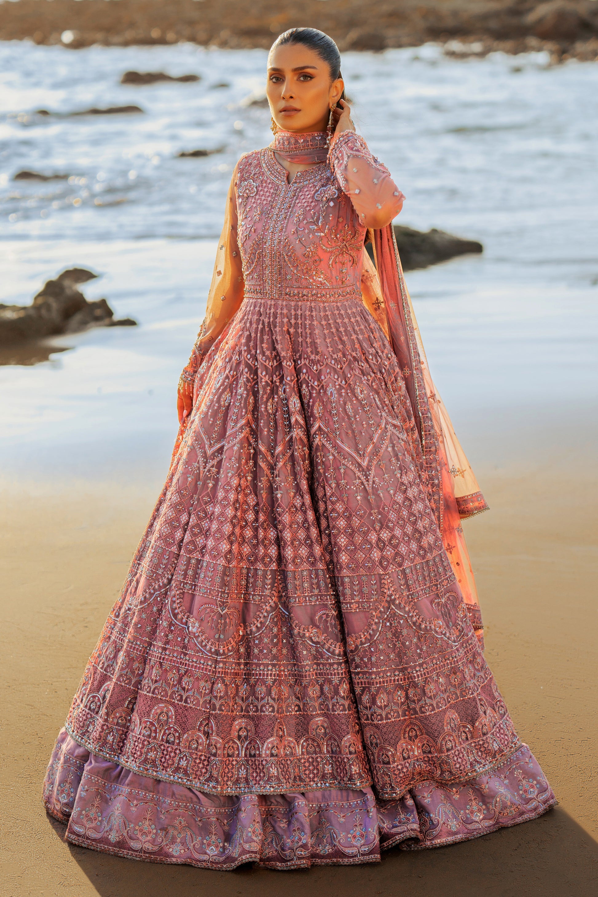 This opulent layered frock is adorned with a round neckline. The bodice & sleeves are adorned with composed motifs & hand adda embellishments all over, along with handmade hangings, crystals & stone work along with embroidery textures & sequin work. The back is adorned with mini hand-embellished motif spray & heavy handmade tassels. The voluminous frock is finely composed with motifs & texture play inspired by the roots of Mughal motifs, Islamic architecture & geometrical patterns. Each panel is adorned with heavy embroidery and sequin work, finished with lavish borders & minimal lace. The second layer is adorned with embroidered & sequin detailed border that adds more volume to the outfit. The dupatta is adorned with embroidered motif spray all over & finished with a 4-sided embroidered & sequin detailed border. The outfit comes with plain straight pants.