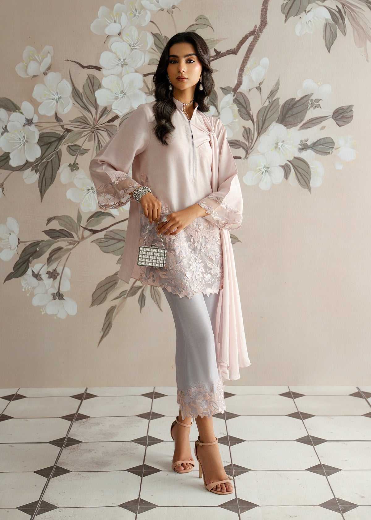 Crafted in luxurious Korean raw silk, the kurti and trousers reflect a poetic blend of femininity and refinement. A timeless luxury pret look for those who adore subtle romance in every stitch.