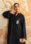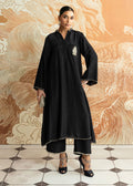 A deep black kameez in Korean raw silk with matching trousers, accented with Mahgul's refined hand-embellishments. The design speaks of quiet strength and understated grace, making a timeless statement with modern poise.