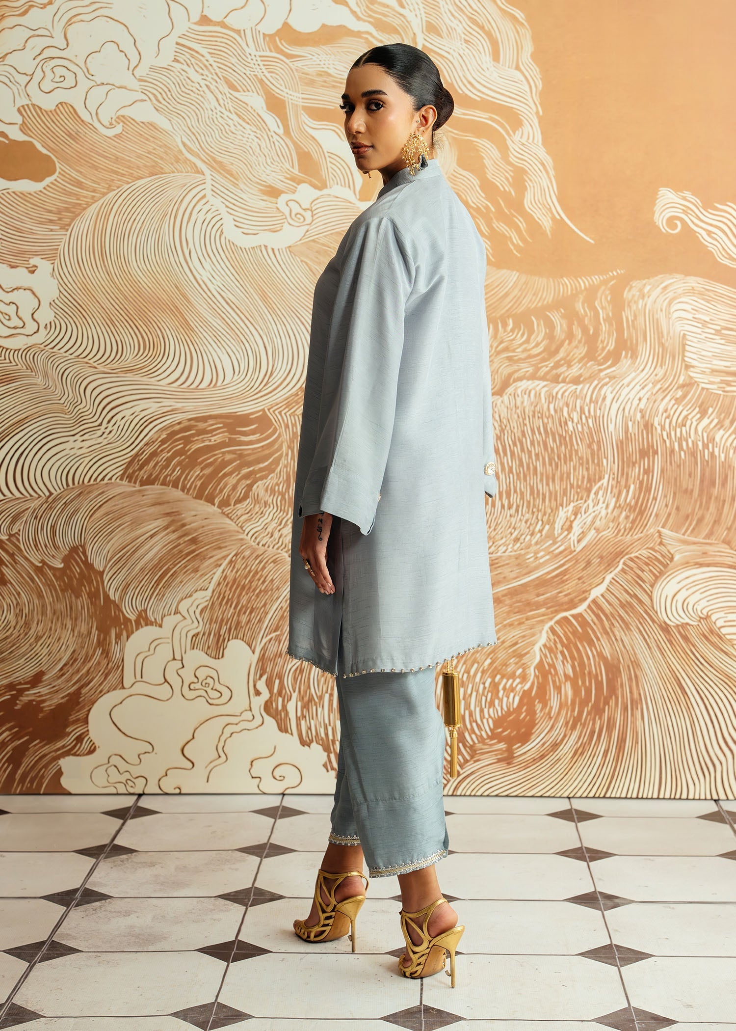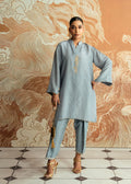 A serene grey kurti in Korean raw silk with matching trousers, delicately uplifted with Mahgul's signature handwork. The ensemble radiates quiet sophistication and contemporary charm, crafted to bring timeless elegance with effortless ease.