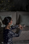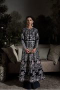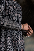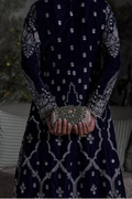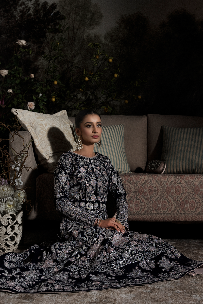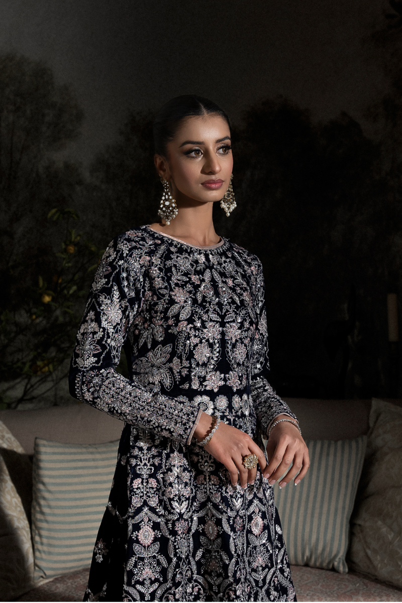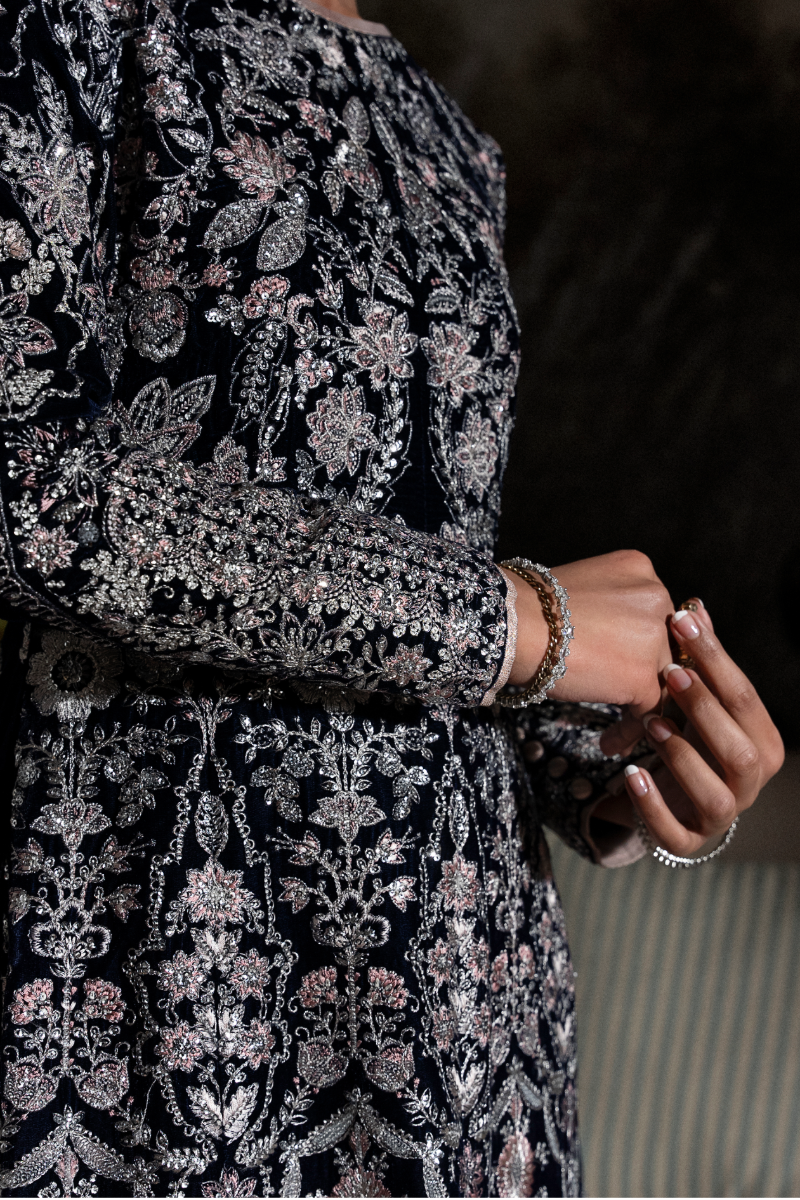 Sapphire features a paneled A-line long shirt crafted in navy blue velvet, intricately embroidered with sequins, rose gold resham, and silver chandi tilla. Fully worked fitted sleeves with delicate button detailing and an equally detailed embroidered back add depth to the silhouette. Paired with flared silk izaar pants, finished with rose gold tissue, the ensemble is designed for evenings that call for statement dressing and refined craftsmanship.