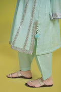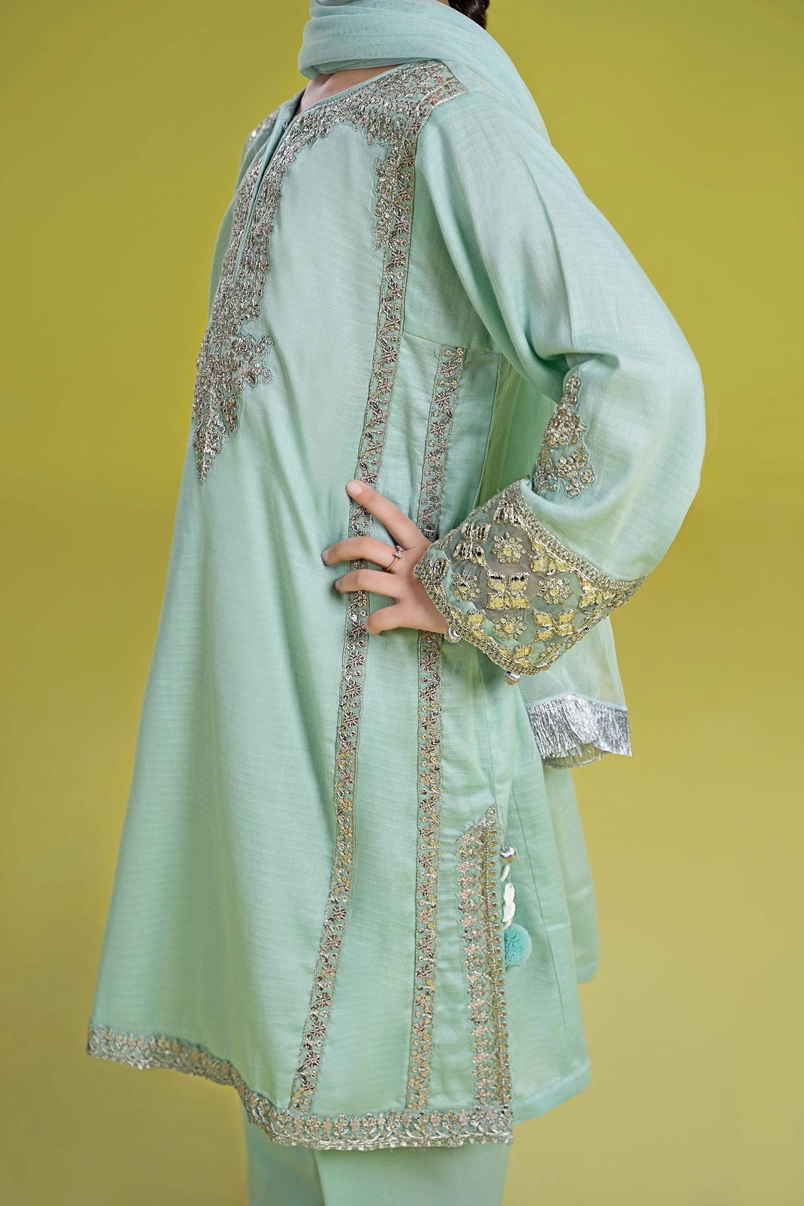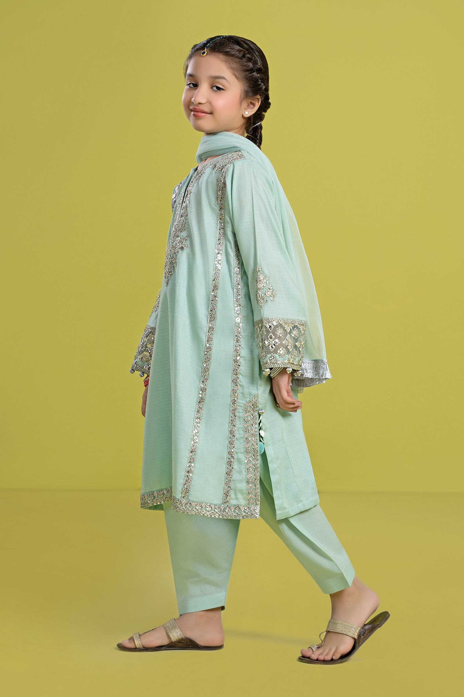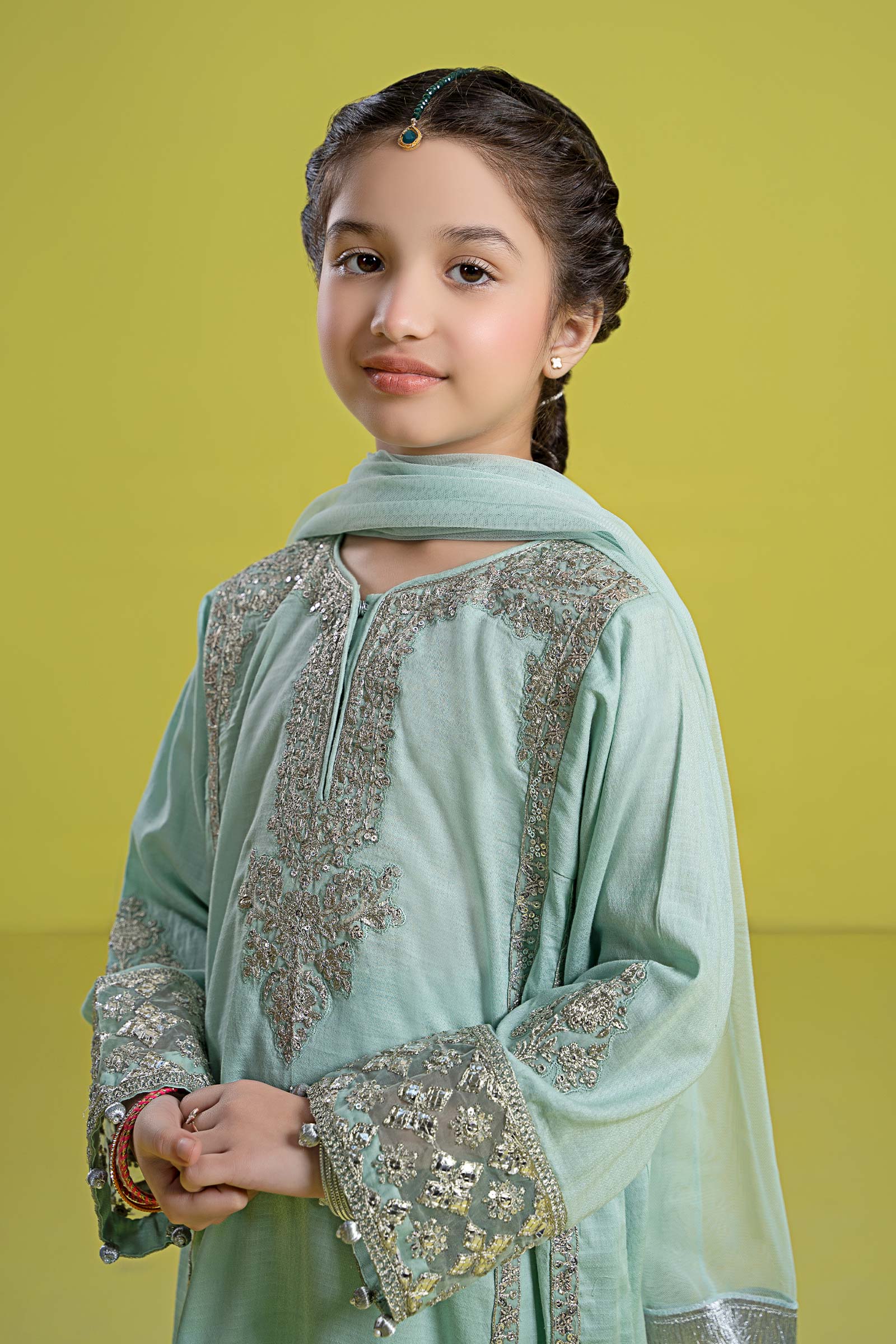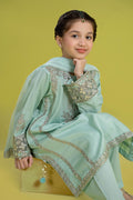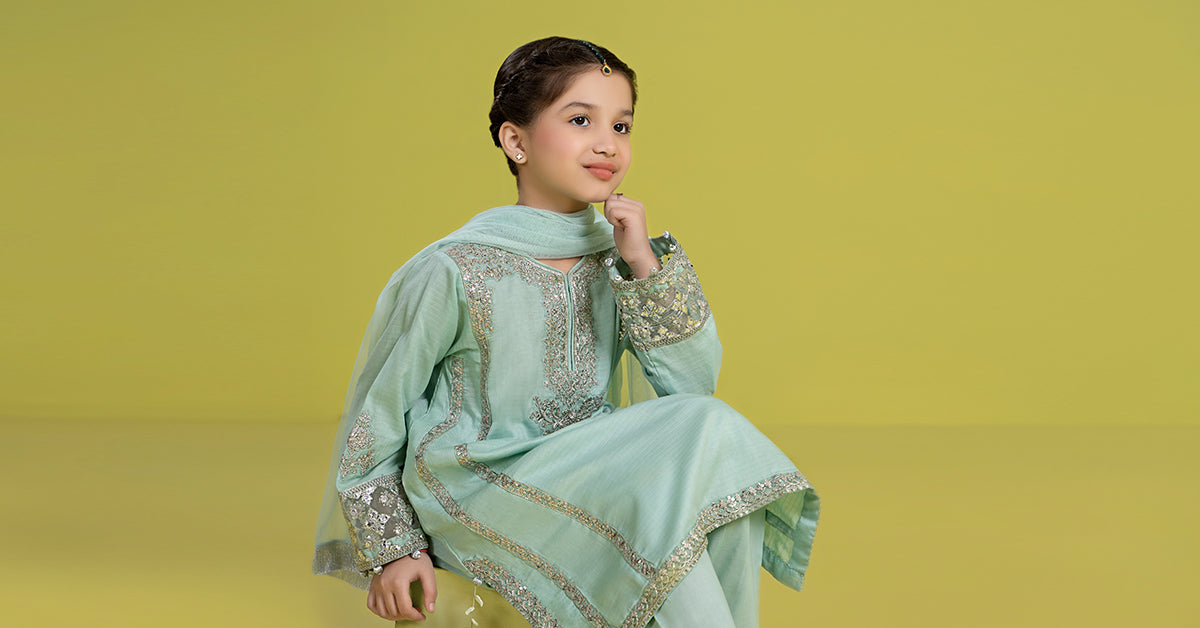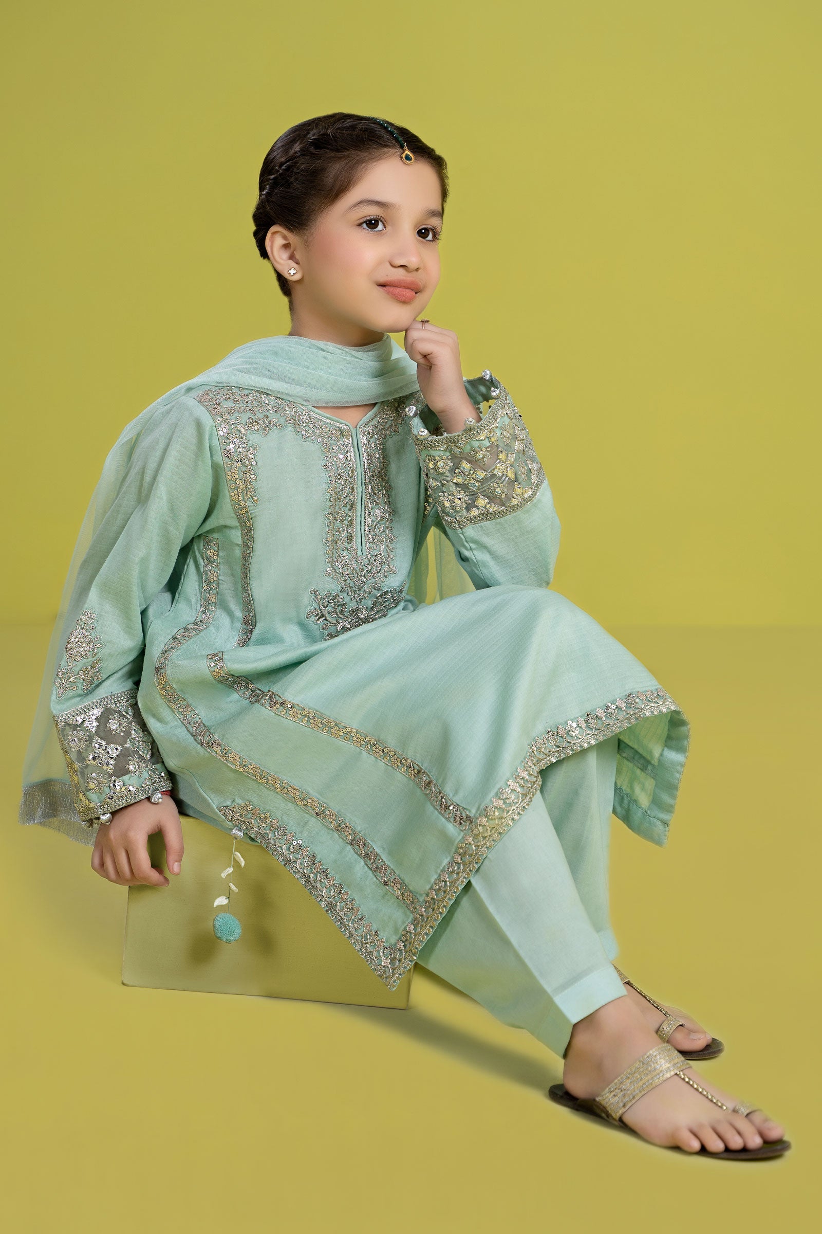 Redefine your little ones' style with our 3 piece embroidered suit; featuring an A-line sequin-tilla embroidered kurta adorned with tilla balls and organza embroidered sleeves patti paired with sequin-tilla embroidered shalwar and a resplendent dupatta boasting a kiran border.