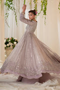 Step into timeless elegance with this Lilac 3-piece pret, designed in a floor-length Anarkali gown that exudes grandeur. The fitted bodice with a high round neckline is richly adorned with exquisite adda work embroidery and sequins, forming symmetrical floral and geometric patterns. Its fully flared paneled skirt glimmers with vertical lines of sequins and thread embroidery, adding movement and charm to every step. The hem is elevated with intricate embroidery, merging floral and geometric artistry for a regal finish. Full-length embroidered sleeves with scalloped edges add to the refined silhouette. Paired with flared grip trousers for graceful balance, this ensemble is perfected with a delicate net dupatta featuring embroidered sprays and four-sided scalloped embroidered borders. A masterpiece of luxury and craftsmanship for the modern muse. 3 Piece Pret Shirt Fabric: Organza Trouser Fabric: Grip Dupatta Fabric: Net Color: Lilac.