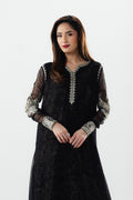 Elevate your wardrobe with this stunning 2-piece pret in timeless black. Crafted in luxurious georget chiffon, the long shirt features a round embroidered neckline with a front slit, all-over hand-printed lining, and delicately embroidered borders. Fitted embroidered sleeves add a touch of elegance, while the georget chiffon sharara with hand-printed lining completes this effortlessly graceful ensemble€”perfect for festive and evening occasions.