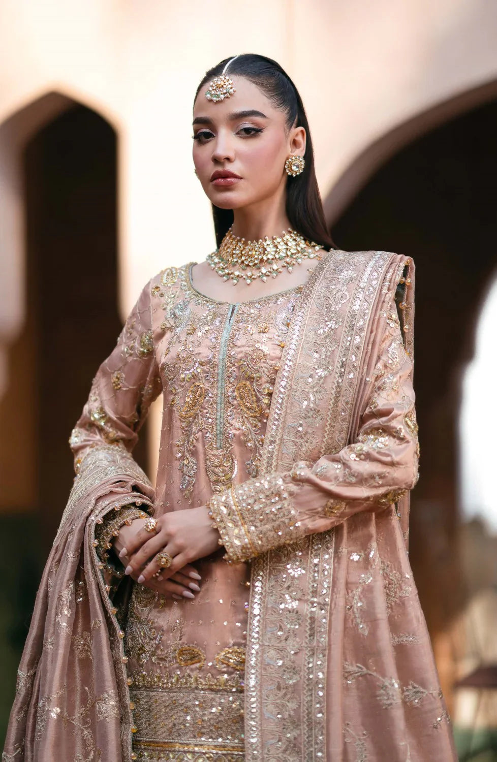 Step into regal allure with this opulent rose-gold bridal ensemble, intricately adorned with fine hand embroidery and shimmering embellishments. The luxurious gharara pants and heavily detailed dupatta bring a timeless, traditional charm, making this outfit perfect for a bride who wishes to shine with understated elegance. Elevate your wedding day look with a piece that blends classic craftsmanship with modern sophistication.