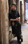 Introducing NUHA a graceful celebration of contemporary and traditional artistry. The black silk vest features palm trees and floral bouquet motifs, enriched with intricate adda work along the hemline. Layered over a short kurta paired with trousers, this ensemble blends traditional craftsmanship with modern minimalism.