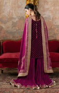 A gorgeous, meganta rose velvet shirt with an intricately embellished neckline in gold and thread work in shades of orange, fuschia and magenta. Pair your outfit with our delicately crushed silk sharara and block printed embellished silk dupata.