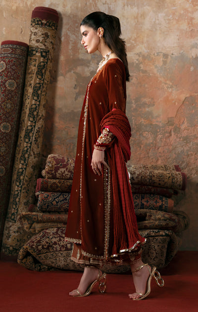 Promising burnt orange elegance, NAME is an enchanting harmony of time-honoured crafts composed on a sumptuous, burnt orange velvet canvas. The angrakha style shirt showcases a delicately hand embellished bouquet pattern will dabka tilla and resham stitches. Each motif is further heightened by gota accents that bestow the ensemble with a majestic grace. Paired with a dazzling silk crushed two toned dupatta, comes with a embroidered culottes.