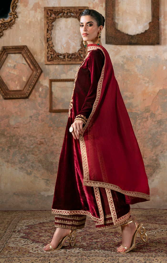 Lustrous, opulent and awash with spell binding modernity. A gorgeous, deep red blood shirt cut from plush velvet with intricately hand embellished neckline with kora and dabka in regal gold blooms the front and sleeves of the shirt to provide an uplifting
