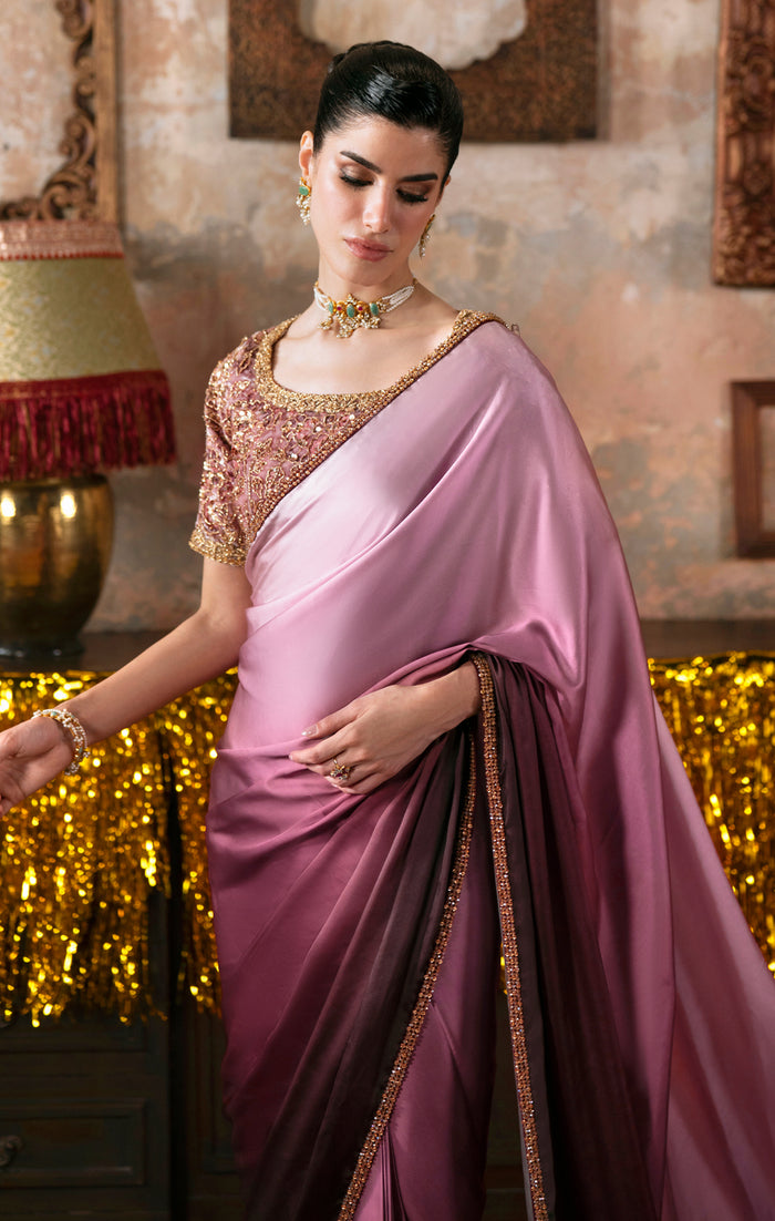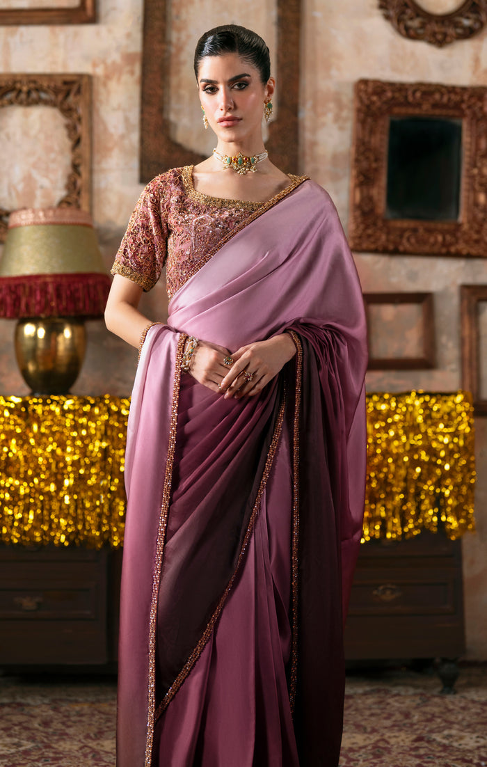 Timeless glamour, for those who want to make an impact. Sleek, monochromatic and spellbinding, the Zermine saree will make you the belle of any ball! A striking blouse, cut from plush velvet, richly embellished with dabka nakshi and sequins hand work.