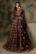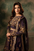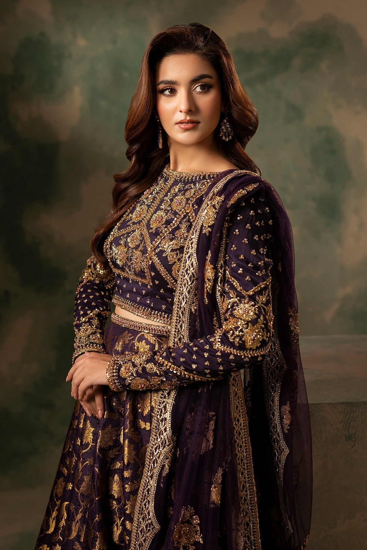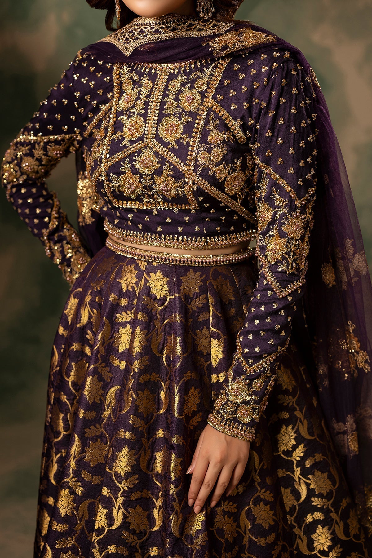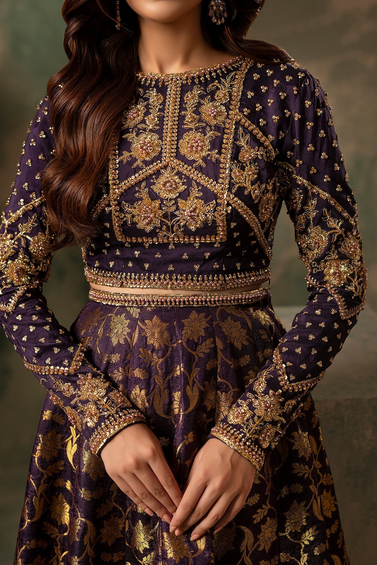 A dark purple, beautifully constructed blouse paired with a net dupatta and a brocade lehenga. The heavily embellished bodice features dabka, pearls, and Swarovski crystals, reflecting a perfect blend of artistry and tradition. This ensemble carries the grace of age-old banarsi craftsmanship, celebrating timeless elegance with a classic traditional touch.