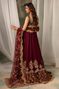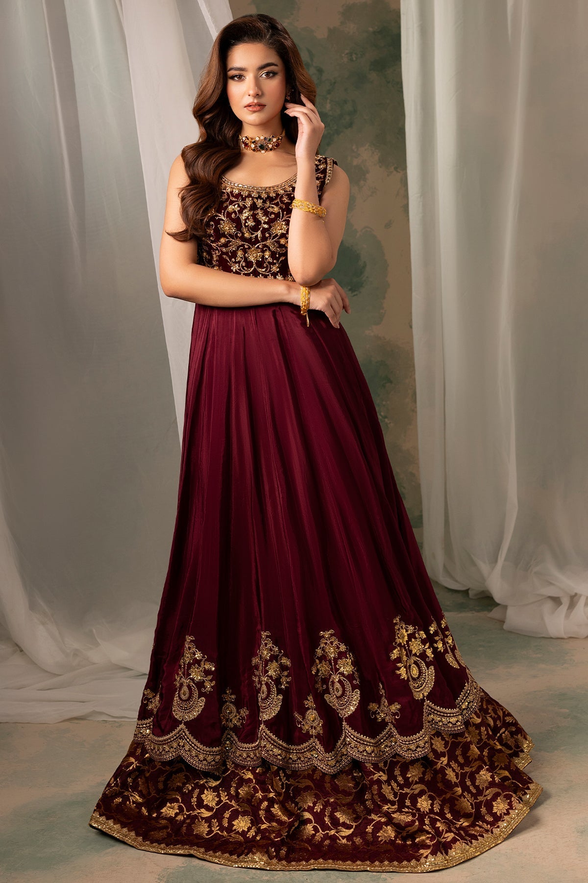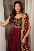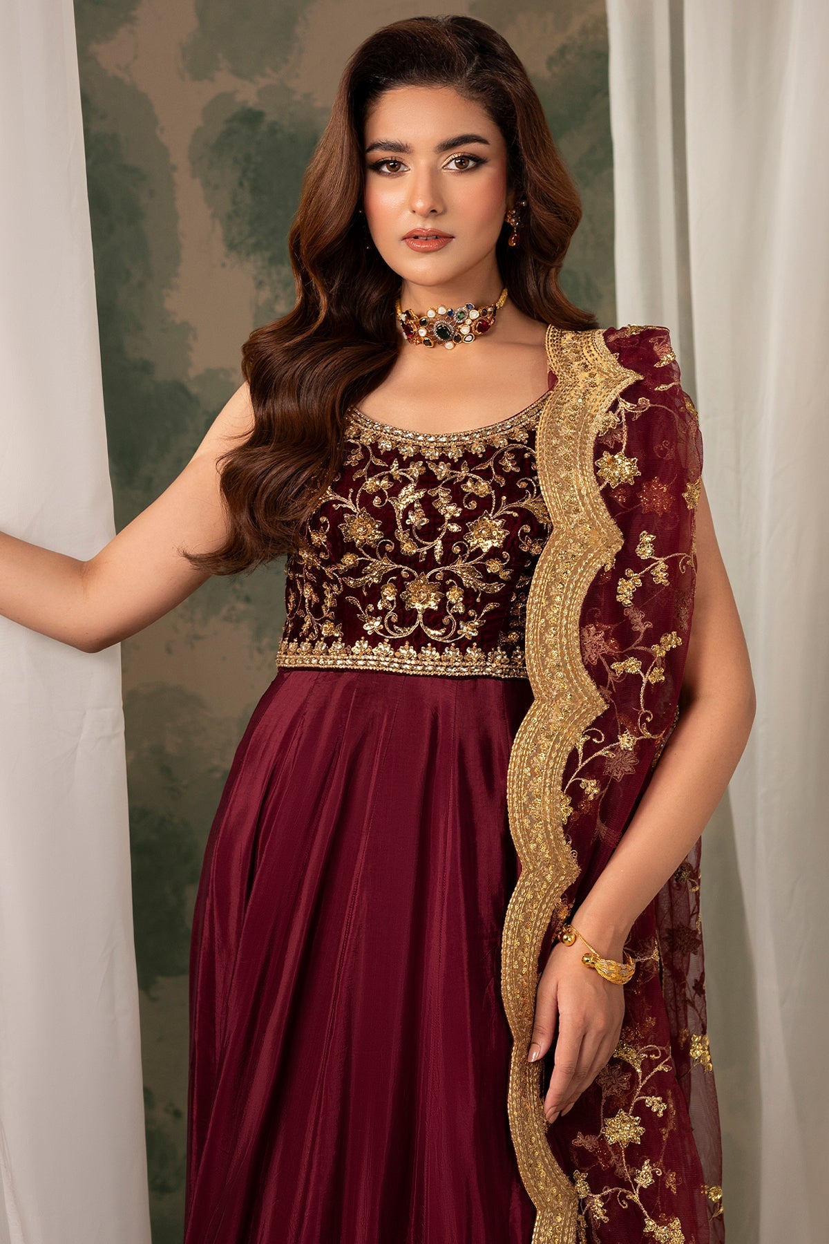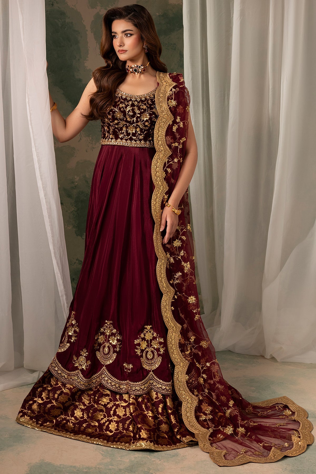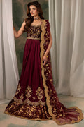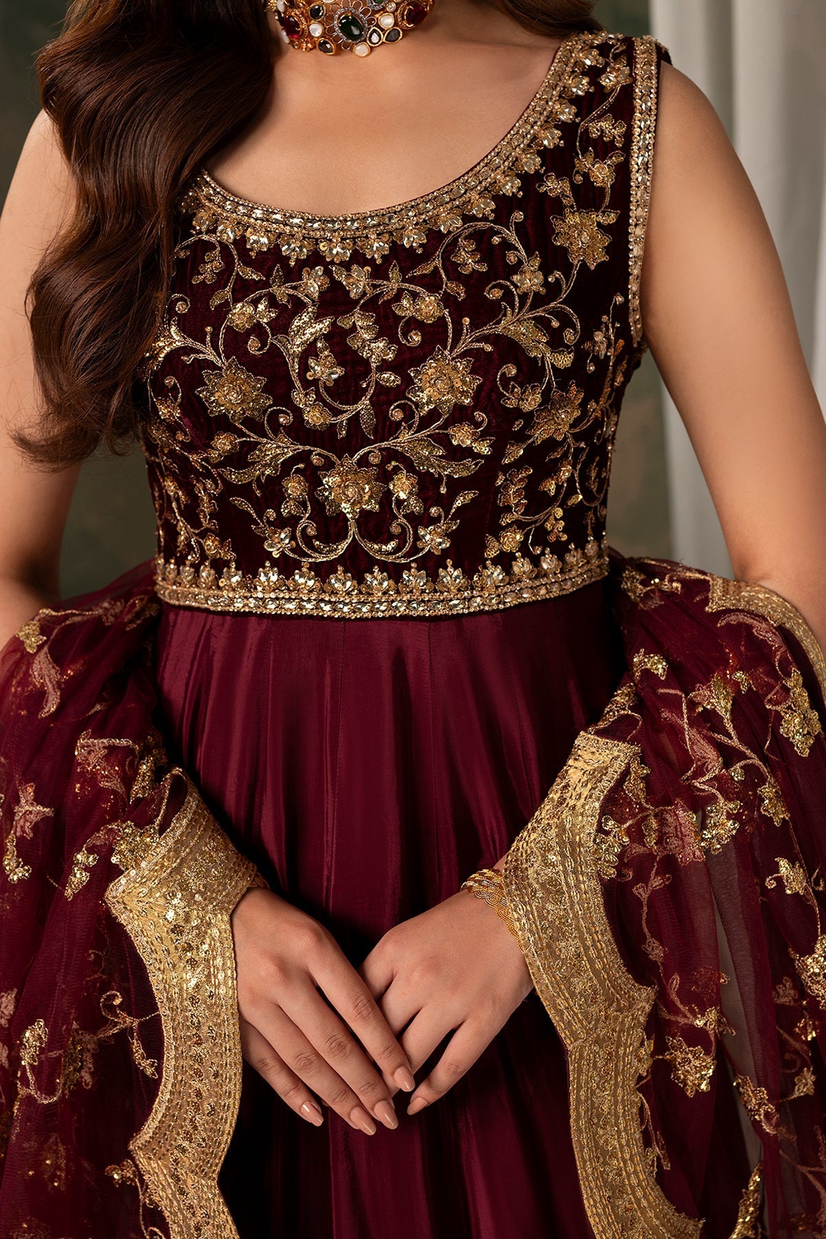 A maroon double-layer pishwas, featuring a medium silk layer over a beautifully woven flared Brocade layer. The velvet bodice is exquisitely embellished with dabka, nakshi, sequins, and Swarovski crystals, paired with a floral jaal net dupatta finished with a tissue border, adding richness and depth to the silhouette.